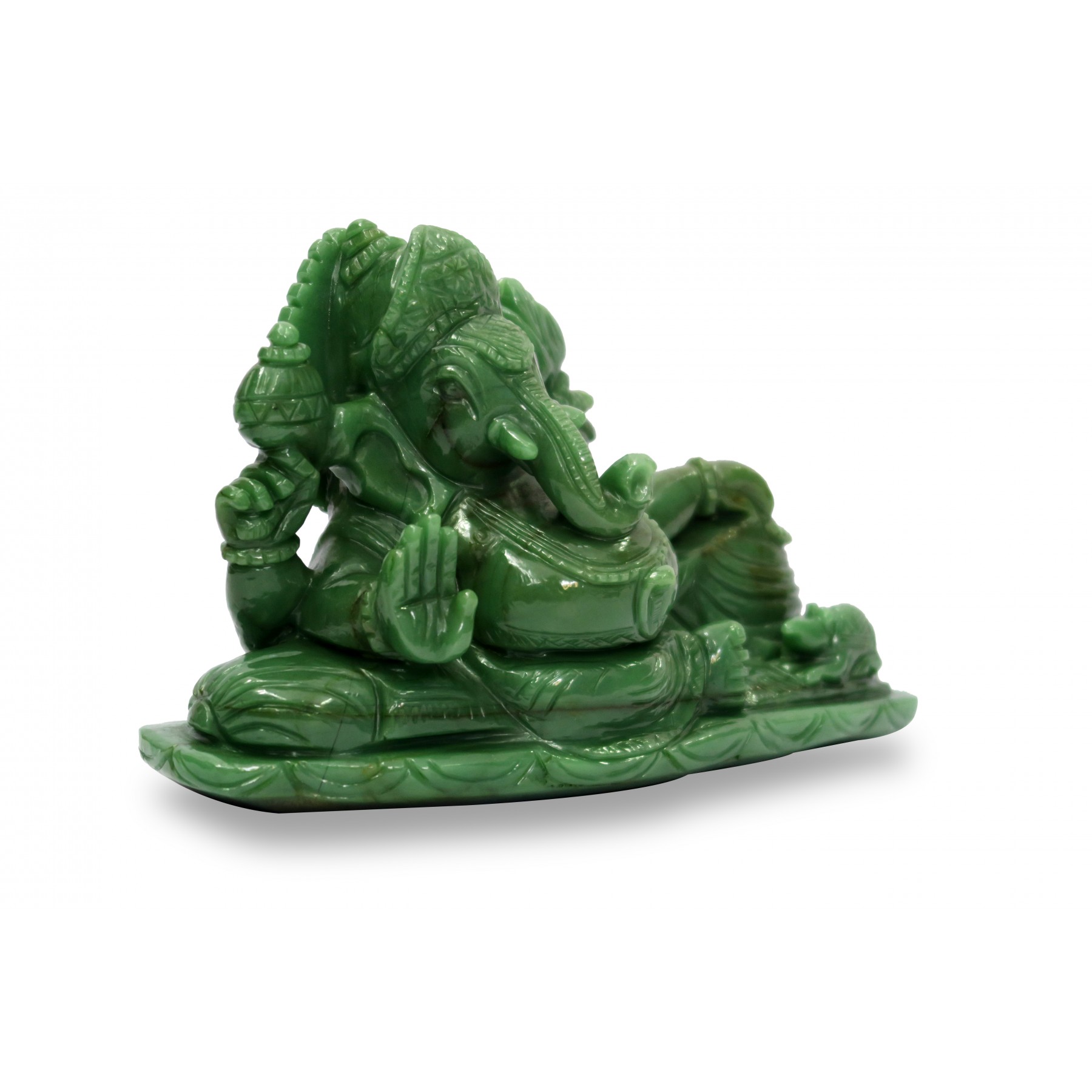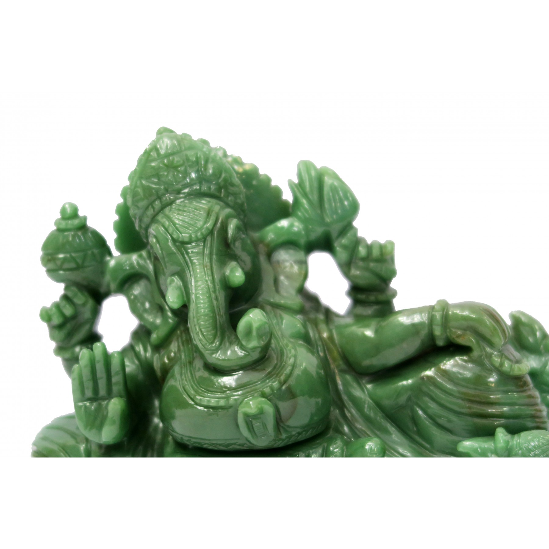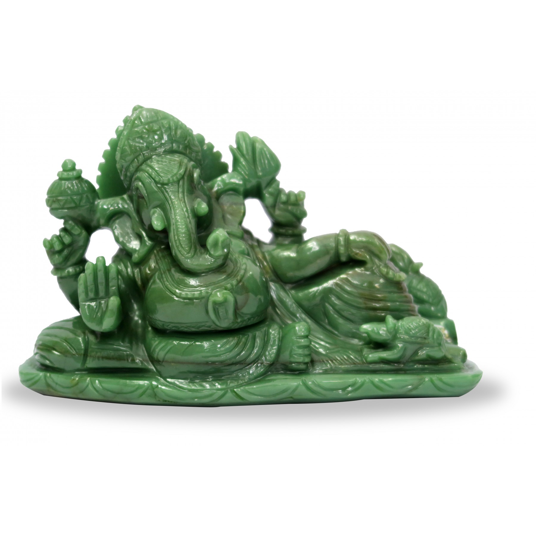In Hindu tradition, Lord Ganesha is considered to be the most auspicious of all Gods, and it is customary to seek his blessings before embarking on any new venture or journey. Lord Ganesha, the son of Lord Shiva and Goddess Parvati, is considered to be the remover of all obstacles. Jade is a symbol of serenity and purity, and signifies wisdom gained in tranquility. Jade is considered a protective stone which soothes the mind and releases negative thoughts. It is believed to have excellent medicinal properties which aids the treatment of kidney problems & adenal glands, removal of toxins and healing of stitches. This exquisitely crafted idol of Lord Ganesha in a resting pose is made of Australian jade, and is ideal for home decor or home worship rooms or as a gift for housewarming or other festive occasions to your family, friends and business associates.