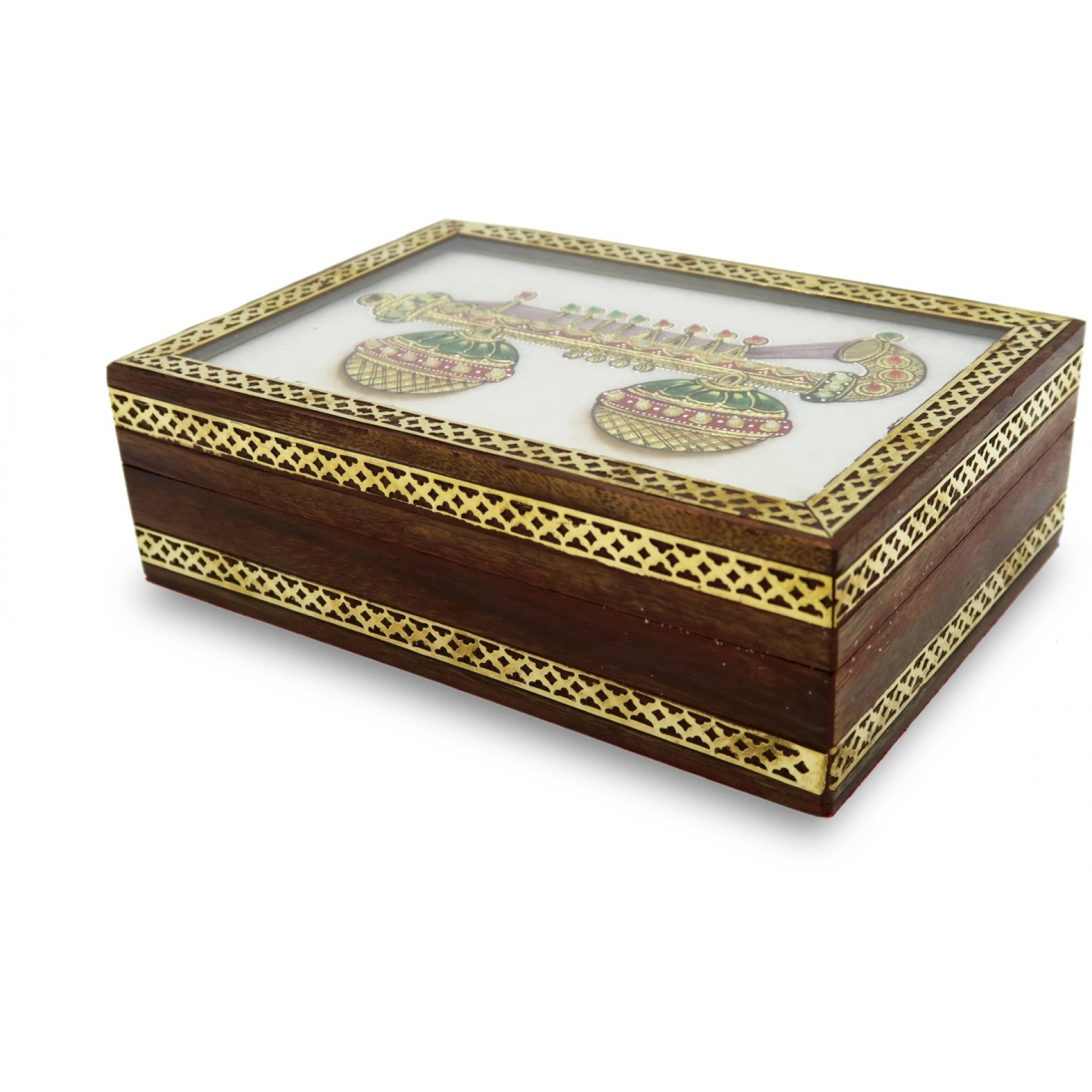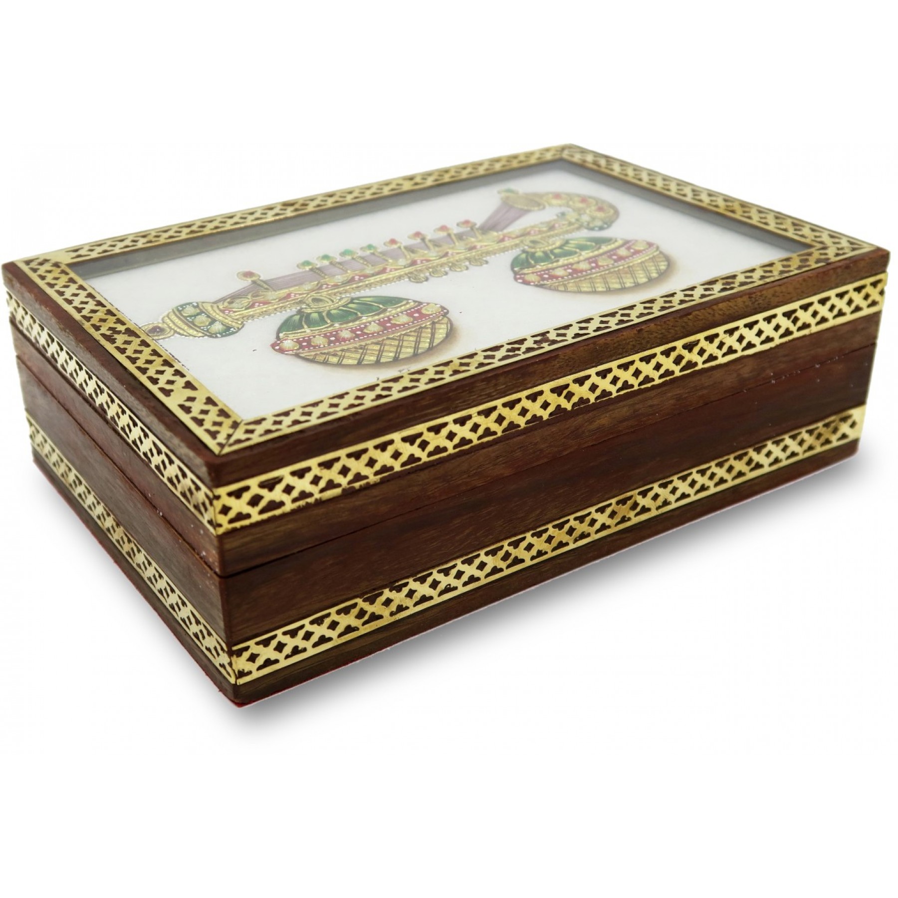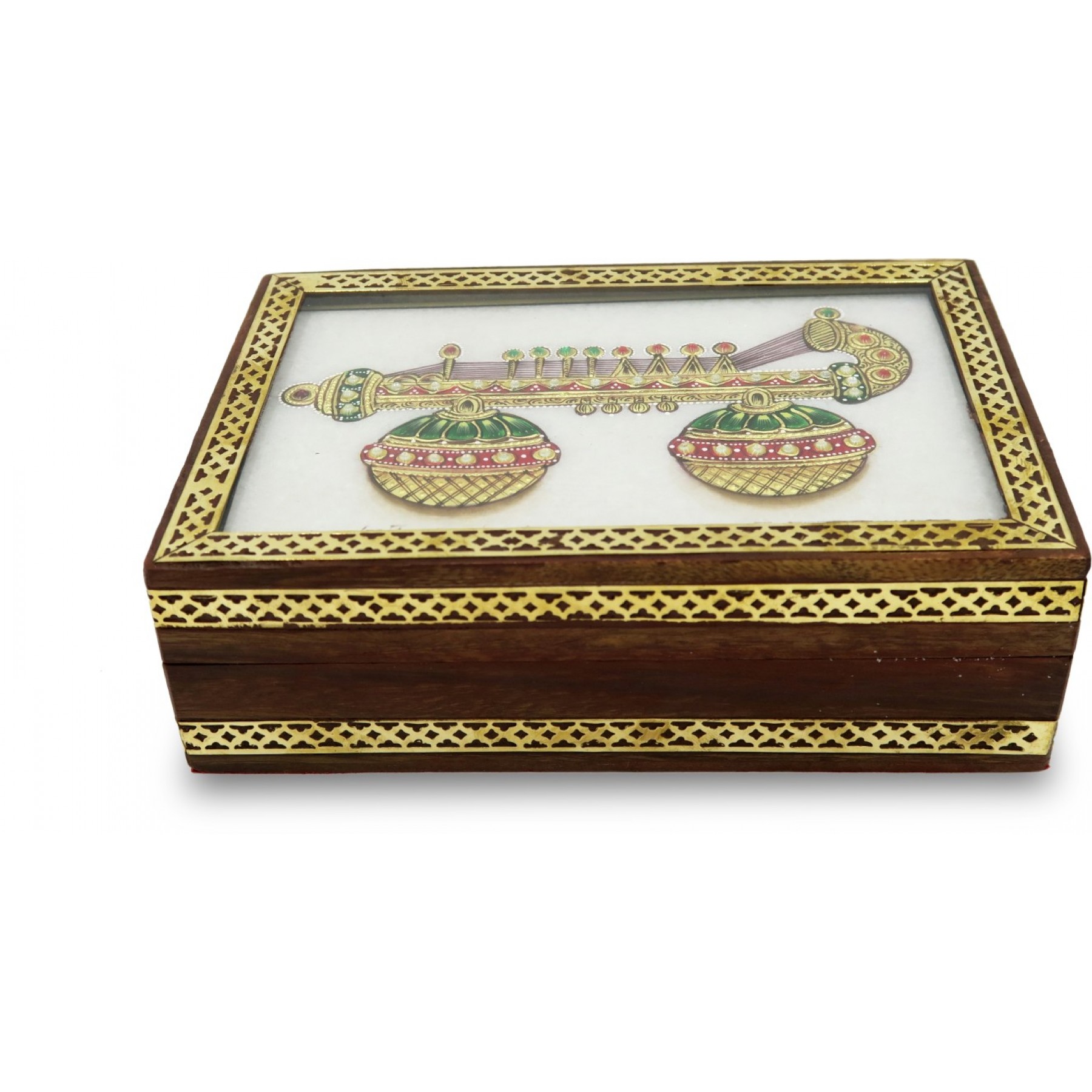This beautiful wooden framed Marble Jewelry Box is a pure work of Art. It is adorned with Kundan Work on top which is typical of Rajasthani Culture. This box can be a very royal looking gift for ladies in your family or any business associate.