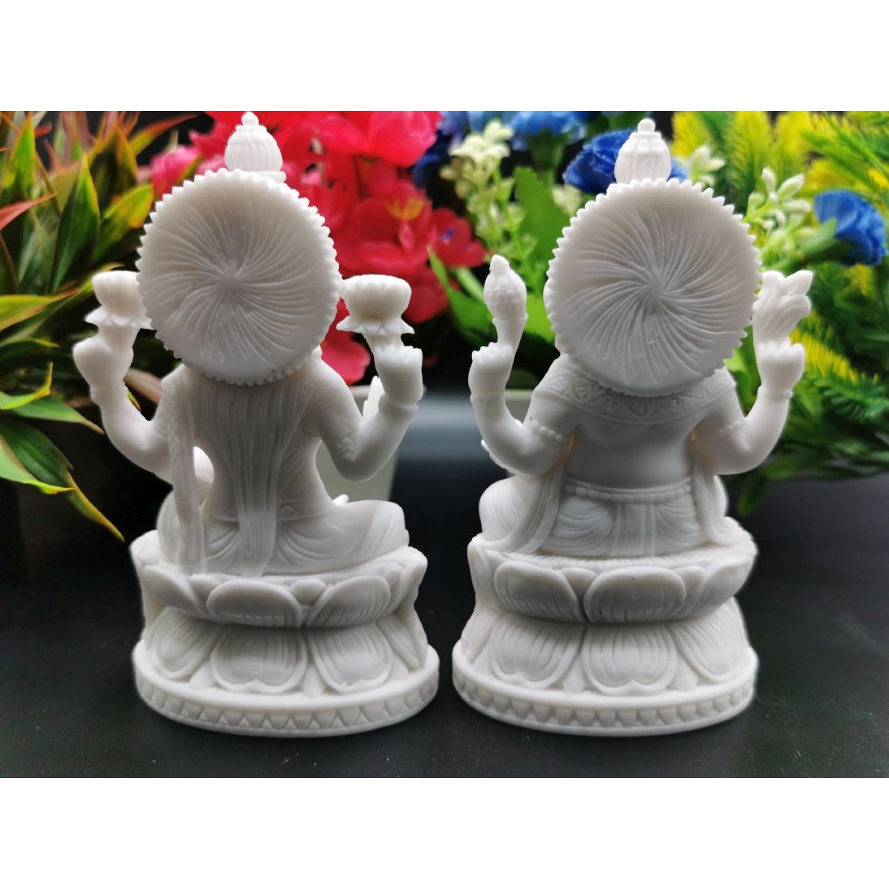 This is a beautifully designed set of two statues/figurines, one each of Goddess Laxmi & Lord Ganesha, for your home during the coming festive season. Laxmi and Ganesha are beautifully carved in marble dust in pristine white, and bear a holy auspicious look. This can be ideal to adorn your homes during the festive season, as well as to gift to your near and dear ones as well as business associates. Keeping a Laxmi Ganesh statue is considered very auspicious in the Hindu culture, and is associated with wealth, success and prosperity.